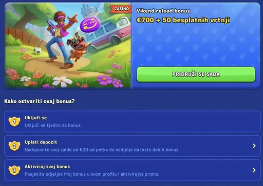 Vikend reload bonus pruža dodatnih 700 eura uz 50 besplatnih vrtnji za depozite tijekom vikenda. Bonus se aktivira automatski za sve registrirane igrače koji ostvare depozit u definiranom vremenskom okviru.